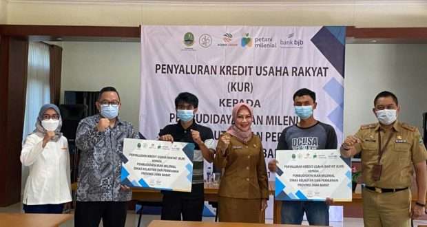 CIANJUR — Sebagai salah satu wujud pemberdayaan petani muda di Jawa Barat, bank bjb menyalurkan kredit kepada para pembudidaya ikan di Jawa Barat yang tergabung ke dalam program Petani Milenial. Kredit disalurkan secara simbolis kepada Dinas Kelautan dan Perikanan Barat di kantor UPTD PSDKP Wilayah Selatan Dinas Kelautan dan Perikanan Ciherang, Kabupaten Cianjur, Senin (7/6/2021).