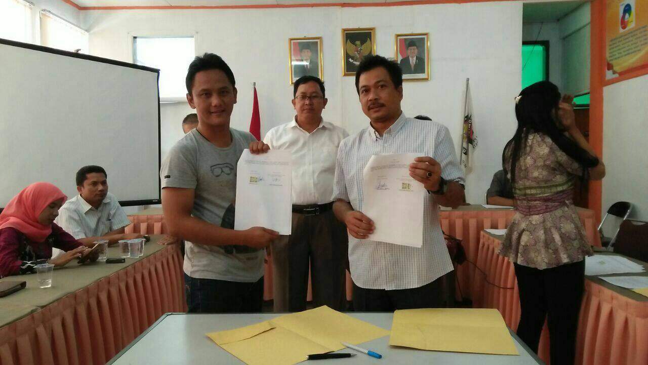 TUNJUKKAN – Ketua KPU Kab Cirebon Saefuddin Jazuli dan Pemred Jabar Publisher Hasan Zaelani (Jay) menunjukkan berkas MoU kerjasama yang sudah ditandatangani.