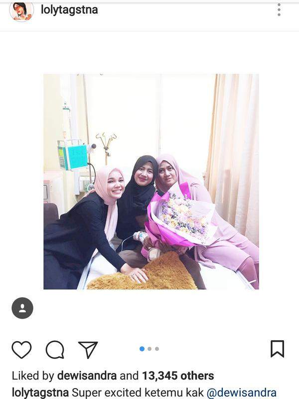 Terlihat dalam foto yang diunggah Lolyta Agustina beberapa waktu lalu, dirinya dijenguk Dewi Sandra. Mantan istri Surya Saputra ini membawakan buket bunga dengan kartu ucapan bertuliskan “Keep fighting Lolyta!”