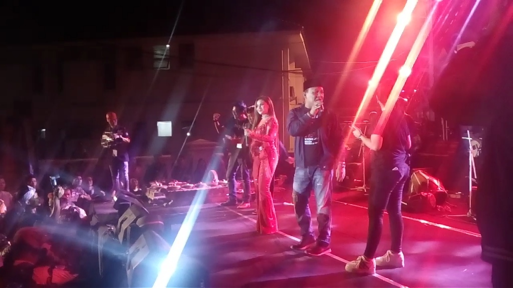 BONGKAR – Kang Jimmy saat menyanyikan lagu Bongkar bersama para penonton dalam acara puncak penggalangan dana untuk korban bencana palu, Jumat (2/11/2018) malam.