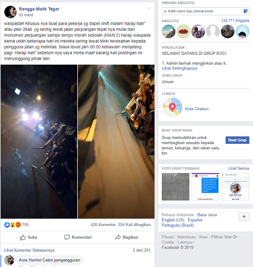 Dalam unggahan yang dipostin di salah satu grup lokal Cirebon, Minggu (29/12/2019) itu, si pemilik akun juga menuliskan kalau keberadaan kelompok bermotor tersebut sangat meresahkan. Bahkank mereka kerap mengganggu pengguna jalan lainnya. Kelompok bermotor meresahkan itu, masih dari tulisan si pemilik akun di FB itu, sudah ada sejak dua hari lalu, sampai sekarang.