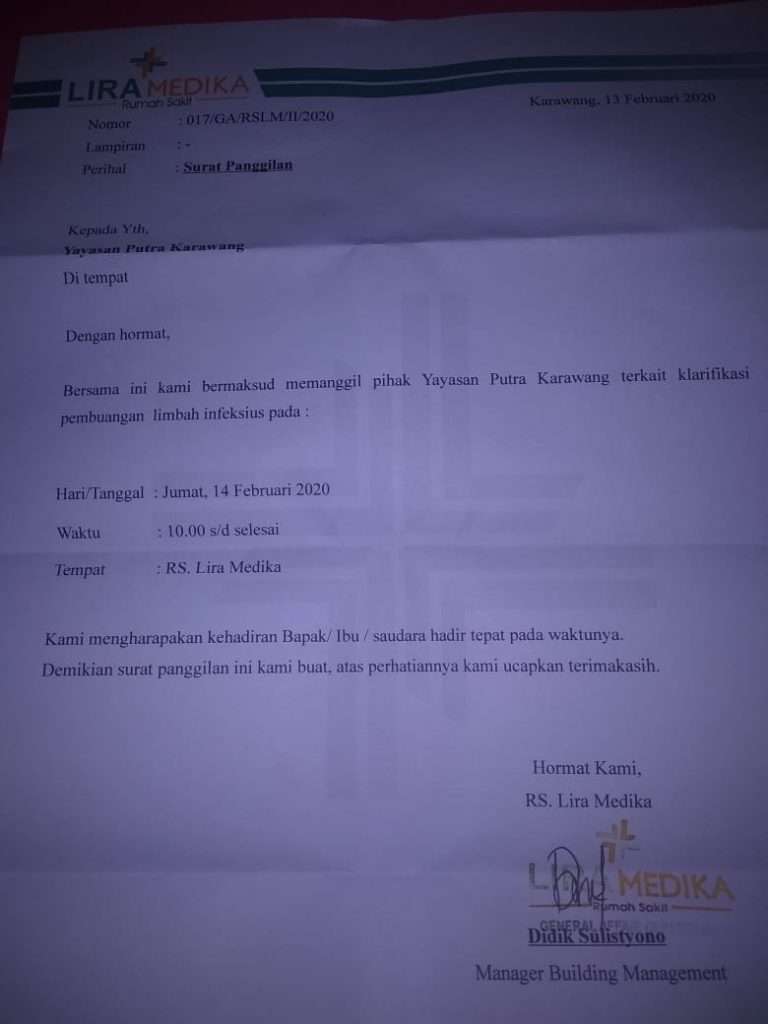 “Kedua, kami pernah menegur keras dan melaporkan ke management Lira Medika, bahkan menunjukan bukti video bahwa, sampah domestik dengan sampah B3 dicampur, dan pelaporan itu sampai ke Dirut Lira Medika dr. Roni dan pemilik Lira Medika Bapak Naik Jhon, sebagai pemutus kebijakan,” ujar Ketua Yayasan Putra Karawang, Mahar Kurnia, SE, dalam siaran persnya, beberapa hari lalu.