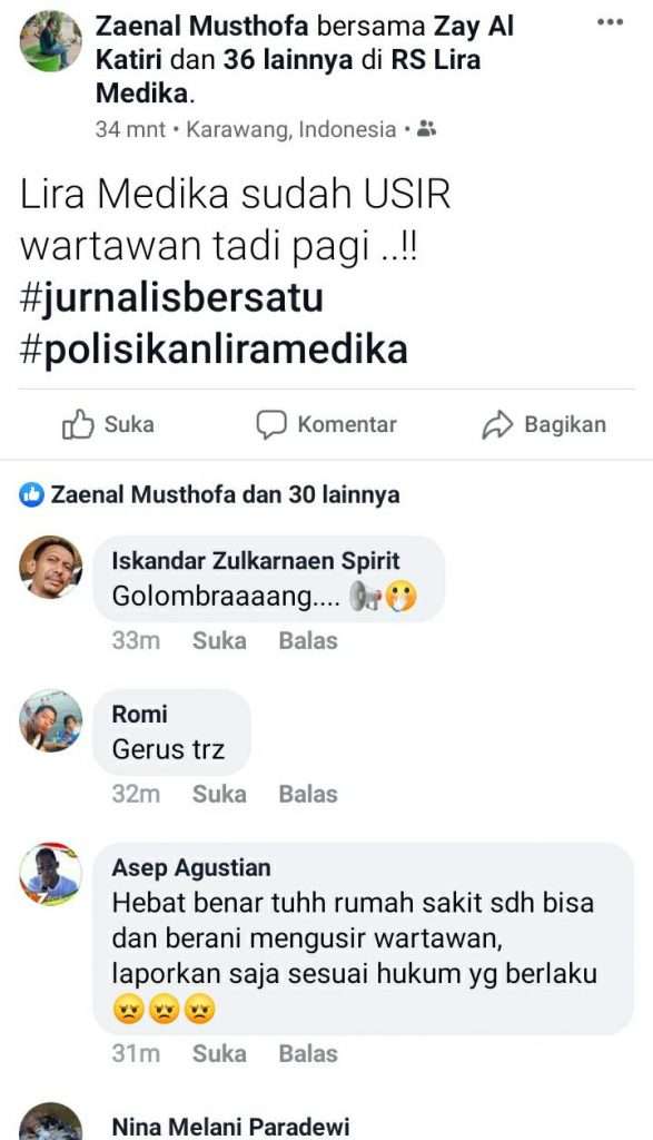 KARAWANG – Pihak RS Lira Media Karawang melakukan pengusiran kepada seorang jurnalis saat melakukan tugas peliputannya? Reaksi pun bermunculan. Umumnya, mengutuk aksi tersebut, bila terbukti pihak RS Lira Medika melakukan aksi tersebut.