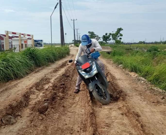 “Sebelumnya kondisi jalan ini bagus karena sudah dicor beton, tetapi saat dimulai proyek perumahan jalan mulai hancur. Apalagi jika hujan, tidak bisa dilewati sama sekali,” keluh Syarif, Sabtu (13/03/2021).