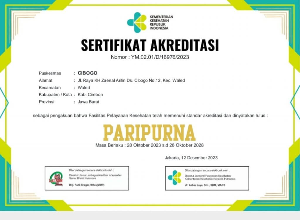 CIREBON – Lagi-lagi acungan jempol layak diberikan untuk UPTD Puskesmas Cibogo, Kec. Waled, Kab. Cirebon yang kembali sukses mempertahankan predikat paripurna dalam agenda re-akreditasi yang dilaksanakan oleh Kementerian Kesehatan Republik Indonesia (Kemenkes RI) tahun 2023.