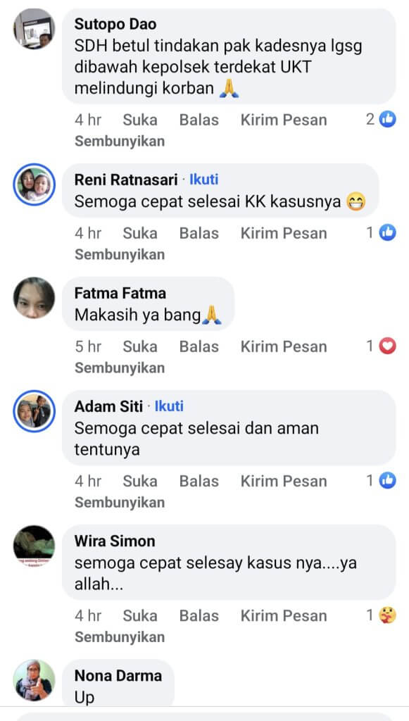“Alhamdulillah, pengaduan kami diterima dengan baik oleh DPPPA. Kita tinggal menunggu tindakan selanjutnya dari mereka untuk hadir mendampingi kasus ini. Langkah selanjutnya menurut keterangan dinas, mereka akan segera melakukan kunjungan (home visit) ke kediaman kami,” ujar Fatma saat tim JP mewawancarainya melalui telepon WA.
