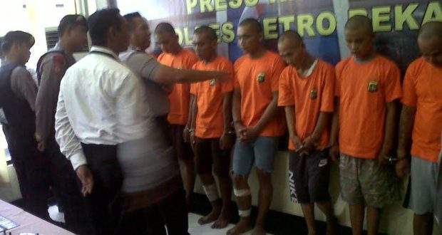 “Dua kelompok Karawang tersebut, yaitu kelompok Bule dan kelompok Baron. Kedua kelompok tersebut dalam aksinya terkenal sadis bersenjatakan golok dan senjata api (senpi), dan mereka pun tak segan-segan melukai korbannya,” paparnya. Dari dua kelompok tersebut, lanjut Kapolres, yakni BH, AN alias J, AS alias W, C alias G, K alias B bin K, IN alias II bin J, EM, dan RH. “Dua tersangka lainnya masih dalam pengejaran polisi (buron),” kata Kapolres.