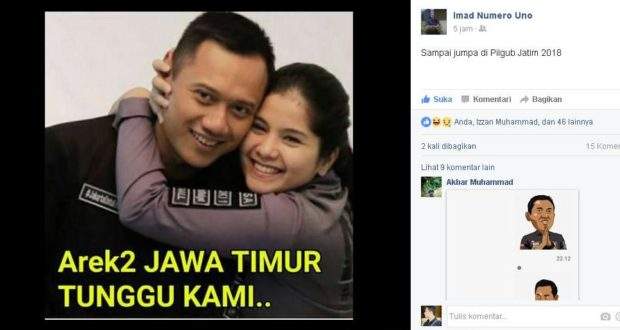 Di jagat maya sendiri, Rabu (15/2/2017) siang, tersiar kabar melalui Meme bahwa anak dari mantan Presiden RI Susilo Bambang Yudhoyono itu akan mengikuti pilkada/Pilgub Jatim tahun 2018. Meme kocak itu diaplod salah seorang pengguna facebook bernama Imad, dengan postingan foto bertuliskan “Arek2 Jawa Timur Tunggu Kami”. Pada foto tersebut terlihat Agus dipeluk mesra sang istri. Hingga berita ini diturunkan, postingan itu sudah di likes sedikitnya oleh 46 pengguna facebook, dibagikan 2 kali dan dikomentari belasan orang. (jay)