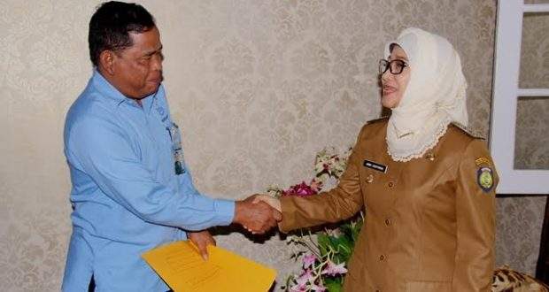 INDRAMAYU – Bupati Indramayu Hj. Anna Sophanah menyerahkan SK Perpanjangan masa jabatan Direktur Utama, dan SK Pengangkatan Sementara Direktur Umum, dan Direktur Teknik pada PDAM Tirta Darma Ayu Indramayu, Selasa (04/04/2017) di Ruang Dalam Pendopo Indramayu.