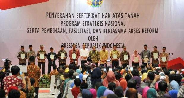 BANDUNG – Sebanyak 6,3 juta dari 19,8 juta bidang tanah di Jawa Barat telah tersertifikasi oleh Pemerintah. Ada 1.998 sertifikat diantaranya diberikan pada hari ini oleh Presiden RI Joko Widodo (Jokowi) di acara Penyerahan Sertifikat Hak Atas Tanah Program Strategis Nasional, Pembinaan, Fasilitasi, dan Kerjasama Akses Reform Tahun 2017 Provinsi Jawa Barat Tahun 2017 di Graha Batununggal Indah, Jl. Soekarno-Hatta Kota Bandung, Rabu (12/4/17).