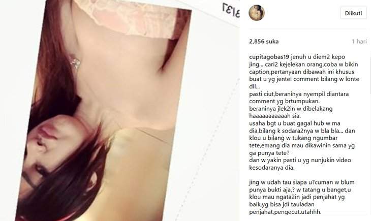 Saking marahnya, artis yang populer lewat lagu berjudul Goyang Basah itu menyebut pelaku dengan nama binatang. “Cari2 kejelekan orang, coba w bikin caption, pertanyaan dibawah ini khusus buat u yg jentel comment bilang w lonte dll,” tulis Cupi Cupita.