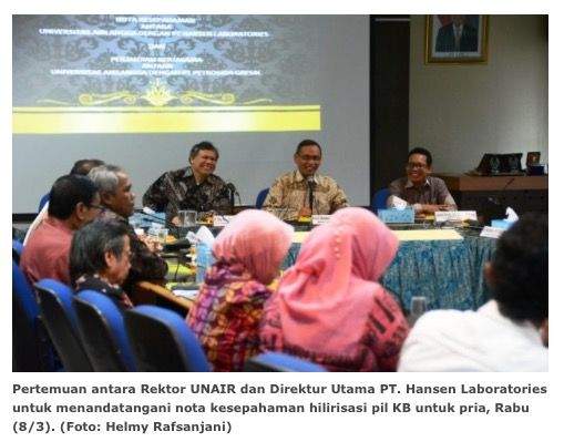 Selain dihadiri pimpinan UNAIR dan PT Harsen Laboratories, tim dari BKKBN juga turut datang menyaksikan penandatanganan nota kesepahaman. Rencananya, BKKBN akan membeli pil KB untuk pria dan dimanfaatkan untuk mensukseskan program KB di Indonesia. Anda tertarik untuk hunting “Pil Ajaib” ini? (dbs)