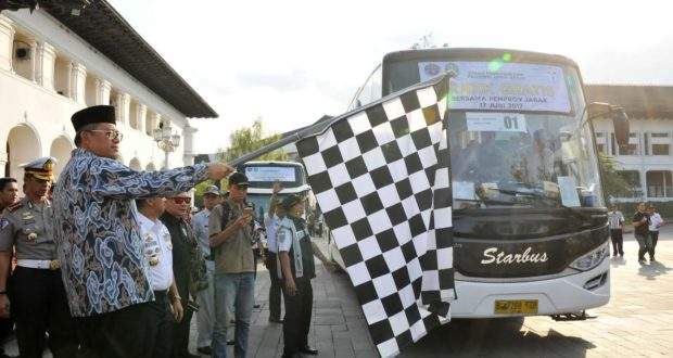 BANDUNG – Gubernur Jawa Barat Ahmad Heryawan (Aher) melepas bus para peserta mudik gratis di Halaman Depan Gedung Sate, Jl. Diponegoro No. 22, Kota Bandung, Sabtu (17/6/17). Melalui Dinas Perhubungan, Pemprov Jawa Barat memberangkatkan sebanyak 2.612 orang peserta mudik gratis dengan tujuan Semarang, Yogyakarta, dan Solo.