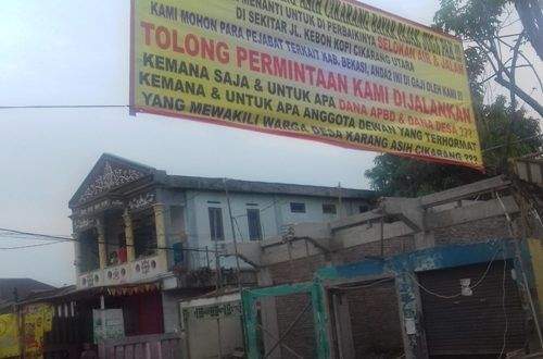 BEKASI – Akibat buruknya pengerjaan drainase atau U-Dith pada tahun 2016 lalu Jalan KH.Fudholi Kampung Kebon Kopi, Desa Karang Asih tergenang air. Dengan ini warga Kampung Kebon Kopi, Desa Karang Asih melakukan aksi penanaman pohon pisang dan memasang spanduk-spanduk untuk mengkritik kinerja pemerintah Kabupaten Bekasi.