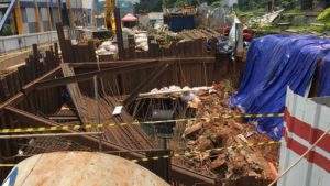 Longsor dinding penahan tanah diduga karena galian konstruksi untuk pondasi proyek Light Rail Transit/LRT jalur Cawang-Dukuh Atas. Pundjung menyebut tidak ada masalah saat penggalian.