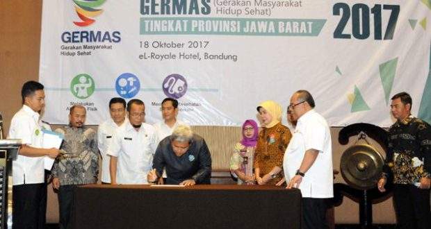 BANDUNG – Gubernur Jawa Barat (Aher) bersama para Kepala OPD dan Bupati/Walikota Provinsi Jawa Barat menandatangani dan melakukan penggalangan komitmen GERMAS (Gerakan Masyarakat Hidup Sehat) Tingkat Provinsi Jawa Barat 2017 di eL-Royale Hotel Bandung, Rabu (18/10/17).
