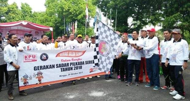 CIREBON – Gerakan sadar Pilkada serentak 2018 Komisi Pemilihan Umum (KPU) Kabupaten Cirebon ditandai dengan gerak jalan sehat bersama seluruh jajaran KPU, Forkopimda, tokoh partai politik dan Masyarakat Kabupaten Cirebon termasuk penyandang disabilitas.