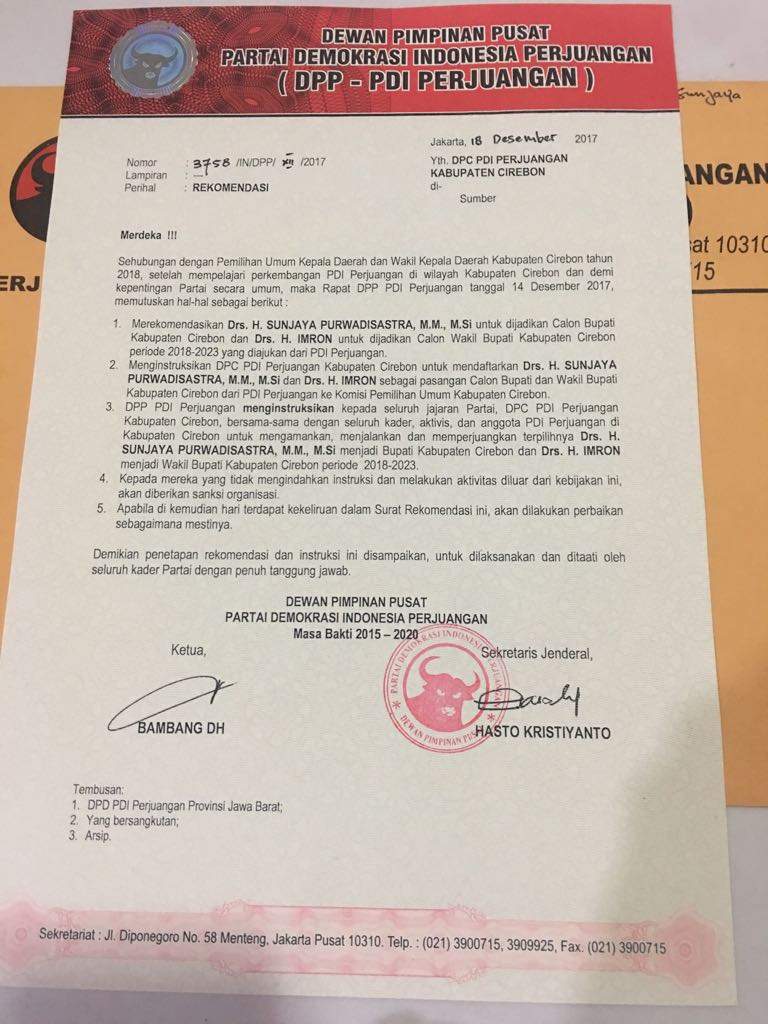CIREBON – Dunia perpolitikan Kabupaten Cirebon sedang digegerkan dengan beredar luasnya surat rekomendasi DPP PDI Perjuangan. Peredaran luas rekomendasi sempat jadi perbincangan masyarakat baik di sosial media maupun pesan singkat.