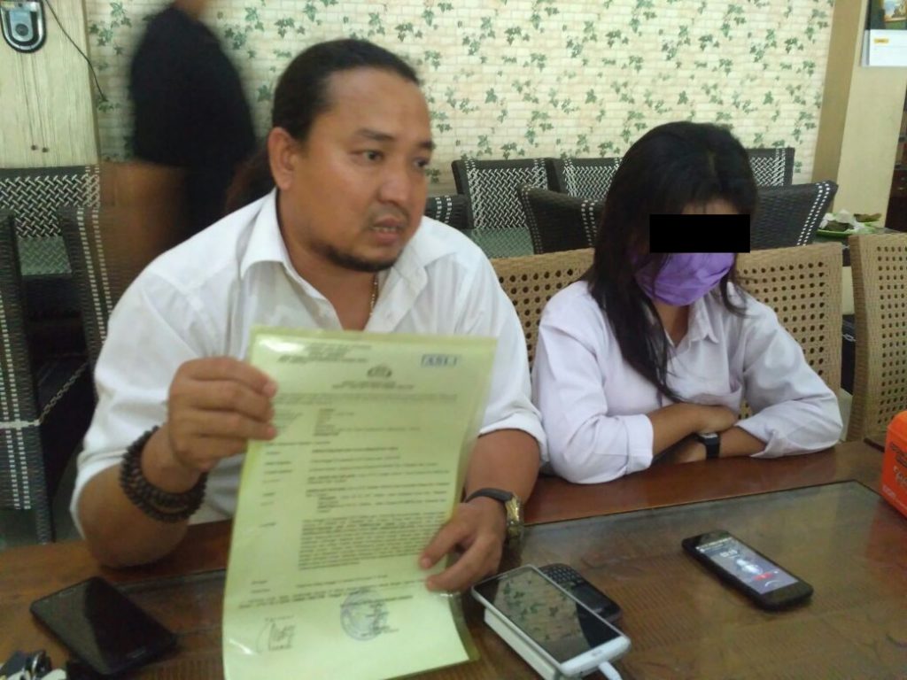 LAPOR – Kuasa Hukum Korban, Qorib Magelung Sakti SH (kiri) bersama korban, “Dara” (kanan), melaporkan kasus dugaan cabul ke Polisi.