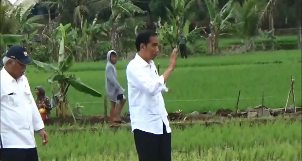 Jokowi yang mengenakan kemeja putih dan bercelana hitam itu berjalan di pematang sawah disambut warga yang telah menunggu sejak pagi. Warga pun antusias dan berebut bersalaman serta mengabadikan dengan kamera ponselnya.