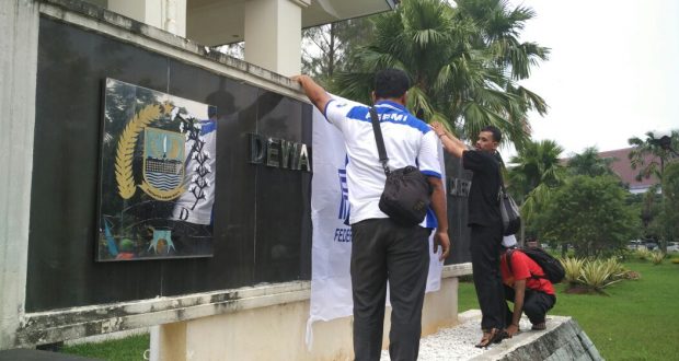 BEKASI – Aksi nekat di lakukan oleh Amirr Mahfouz (Sekretaris KC FSPMI) dan Suparman (Staff konsulat cabang FSPMI) dengan menutup pagar gedung DPRD Kabupaten Bekasi dengan bendera organisasi FSPMI.
