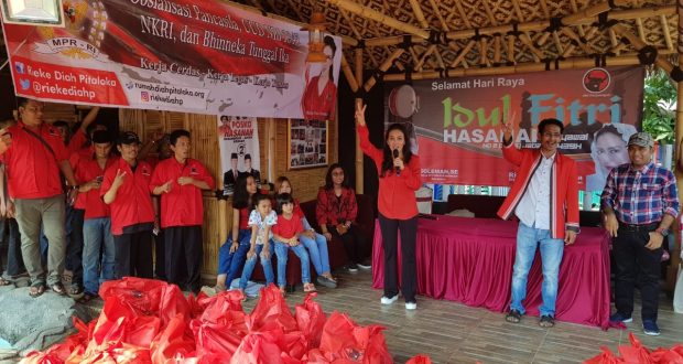 BEKASI – Anggota Komisi VI DPR-RI, Rieke Diah Pitaloka, melakukan Sosialisasi Empat Pilar Pancasila, UUD NRI 1945, NKRI dan Bhinneka Tunggal Ika. Jumat, (10/6) kemarin. Kegiatan ini bertujuan semata-mata agar masyarakat tahu arti Empat Pilar Pancasila. Tidak hanya itu, kegiatan Sosialisasi Empat Pilar ini juga dikawal langsung oleh para pengurus DPC, PAC, Ranting dan Anak Ranting PDI Perjuangan Kabupaten Bekasi. Acara ini digelar di kediamanan Ketua DPC PDI Perjuangan Kabupaten Bekasi, Soleman, di Kecamatan Tambun Selatan, Kabupaten Bekasi.