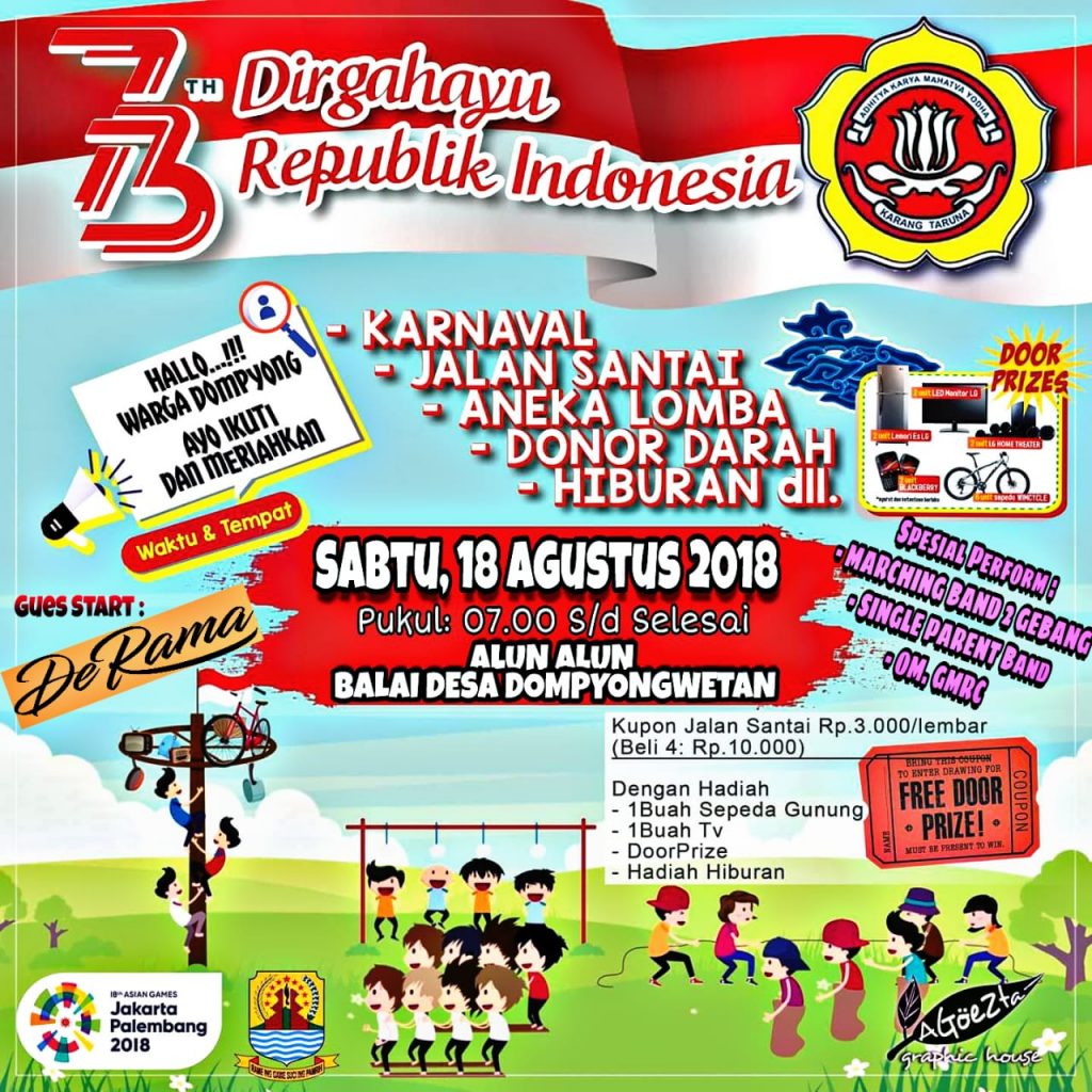 “Datang, ikuti, dan sukseskan rangkaian acara Dirgahayu RI ke-73 persembahan dari kami. Karena selain seru, ada banyak hadiah yang sudah kami siapkan untuk masyarakat,” ujar Awan, Ketua Panitia sekaligus Ketua Karang Taruna Dompyong Wetan. Kepada JP, Ia memberikan sedikit bocoran rundown acara yang bakal digelar besok.