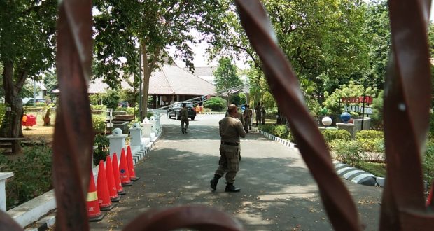 Rumah dinas Bupati Cirebon dijaga ketat puluhan Satpol PP Kabupaten Cirebon. Wartawan yang hendak masuk ke dalam pendopo tidak diperbolehkan oleh petugas. (gfr)
