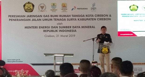 CIREBON – Menteri Energi dan Sumber (ESDM) Daya Mineral, Ignasius Jonan meresmikan jaringan gas (jargas) bumi rumah tangga Kota Cirebon dan penerangan jalan umum (PJU) tenaga surya, Kamis, (21/3/2019) di Lapangan Kebon Pelok, Kec Harjamukti, Kota Cirebon.