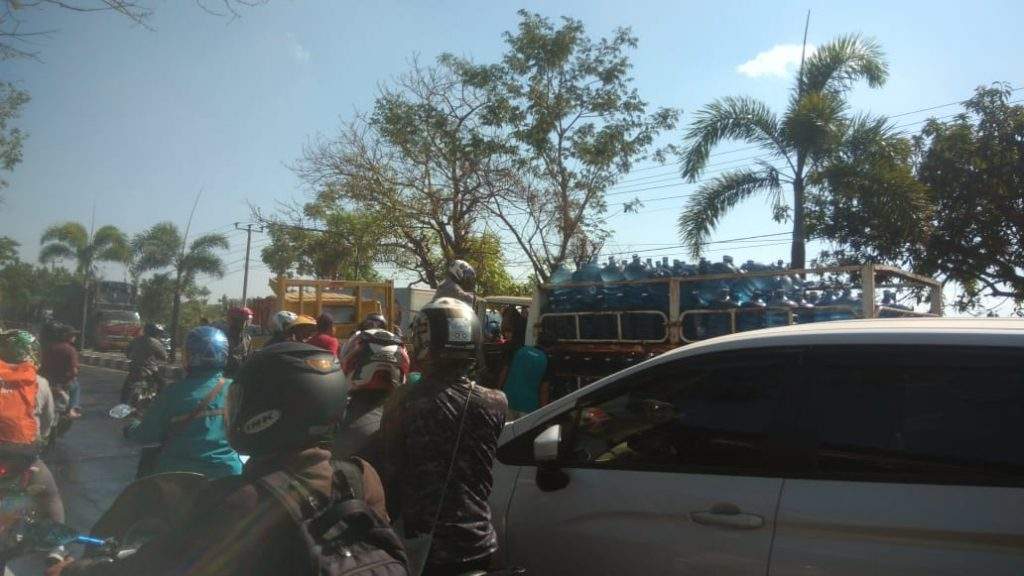 Sementara mobil ketiga truk engkel bermuatan air mineral merk Aqua menghajar buritan truk tadi.