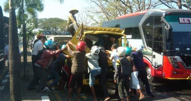 Insiden naas itu mengakibatkan awak kendaraan terjepit. Mobil truk dengan nopol E 8587 YD seruduk kendaraan di depannya yang belum teridentifikasi alias kabur. Sopir yang mengenakan baju batik biru itu terjepit di belakang kemudi.
