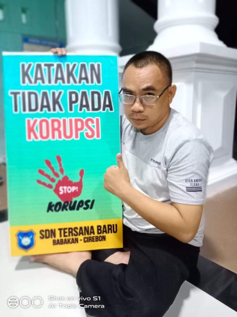 Dalam foto tersebut menggambarkan sebuah banner yang bertuliskan “Selamat Datang Tim KPK dalam rangka monitoring dan evaluasi implementasi pendidikan antikorupsi di SDN Tersana Baru”. Nampak seorang pria yang tengah berfose di dekat spanduk berbackground biru cerah tersebut.
