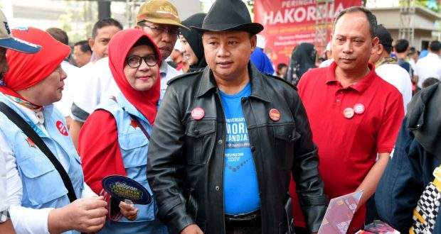 BANDUNG – Wakil Gubernur (Wagub) Jawa Barat (Jabar) Uu Ruzhanul Ulum membacakan deklarasi Generasi Milenial Antikorupsi yang diikuti oleh ratusan siswa SD hingga SMA se-Bandung Raya di area Car Free Day Dago Kota Bandung, Minggu (15/12/19).