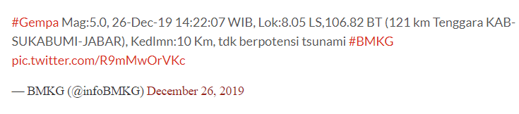 Badan Meteorologi, Klimatologi, dan Geofisika (BMKG) lewat akun resminya menyebut, gempa berkekuatan 5,0 SR terjadi di kawasan Sukabumi, Kamis (26/12/2019) pukul 14.22 WIB.