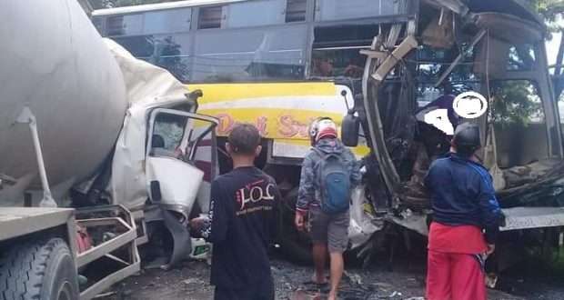 CIREBON – Truk tengki tabrakan dengan Bus Dewi Sri yang syarat penumpang, di jalur Pantura, Gebang, Kabupaten Cirebon, Selasa (21/1/2020). Penyebabnya, truk tengki nyeberang jalur. Akibat insiden itu, jalur Pantura Cirebon-Jawa Tengah pun macet.