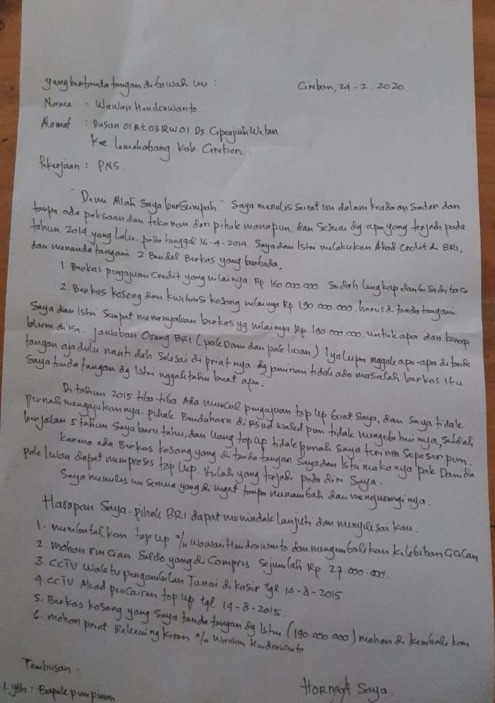 Begini isi surat komplain yang disampaikan Wawan Hendrawanto: “Demi Allah saya bersumpah, saya menulis surat ini dalam keadaan sadar dan tanpa ada paksaan dan tekanan dari pihak manapun. Dan sesuai dengan apa yang terjadi pada tahun 2014 yang lalu, pada tanggal 16-4-2014 saya dan istri melakukan akad kredit di BRI dan menandatangani dua bendel berkas yang berbeda,” tulis Wawan Hendrawanto langsung dengan tulisan tangannya.