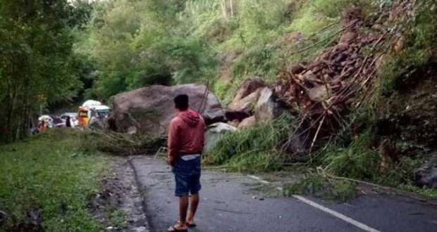 GARUT – Jalur Garut-Pameungpeuk putus, Senin (2/3/2020). Longsor batu menutup dua lajur jalan. Akibatnya, kendaraan tak bisa melintas.