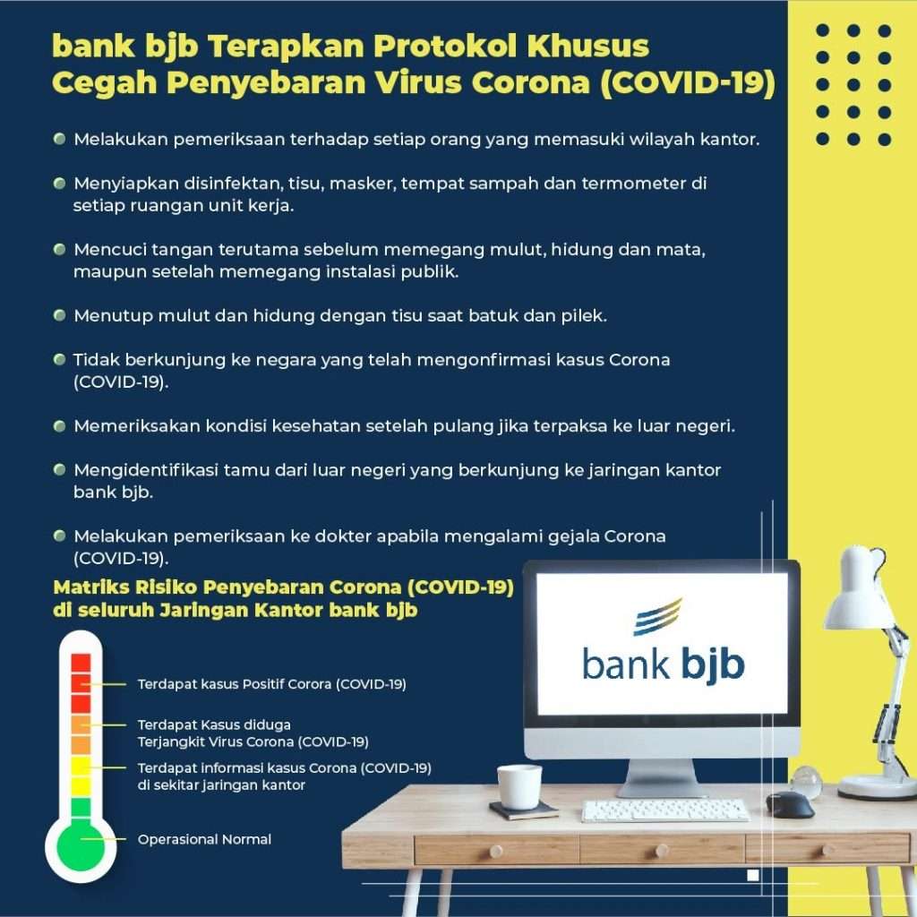 Pemimpin Divisi Corporate Secretary bank bjb Widi Hartoto mengatakan standar protokol khusus ini diterapkan sejak perkembangan Virus Corona memperlihatkan gejala perluasan dan telah ditetapkan oleh World Health Organization (WHO) sebagai Pandemi merujuk pada penyakit yang menyebar ke banyak orang di beberapa negara dalam waktu yang bersamaan. Jumlah penyebaran virus corona sendiri bertambah signifikan dan berkelanjutan secara global. Perseroan melakukan hal tersebut dengan tujuan menumbuhkan kesadaran kritis sekaligus melindungi sumber daya manusia (SDM) bank bjb dari ancaman yang berpotensi membahayakan.