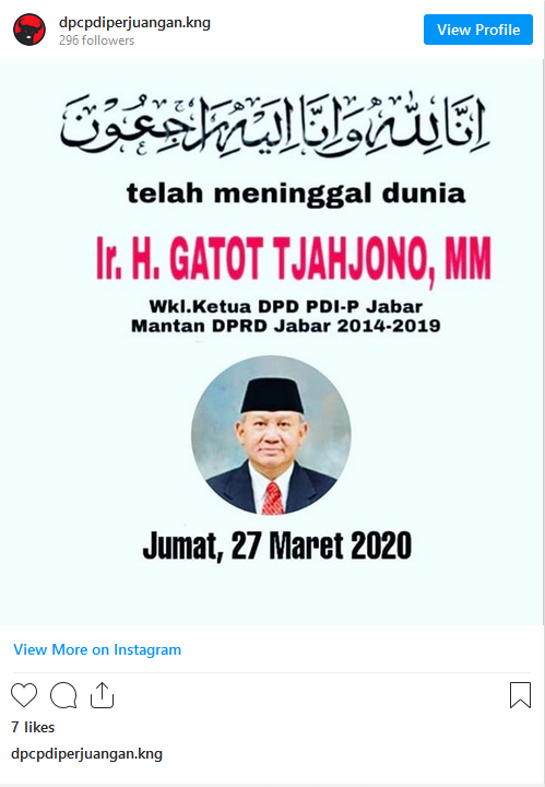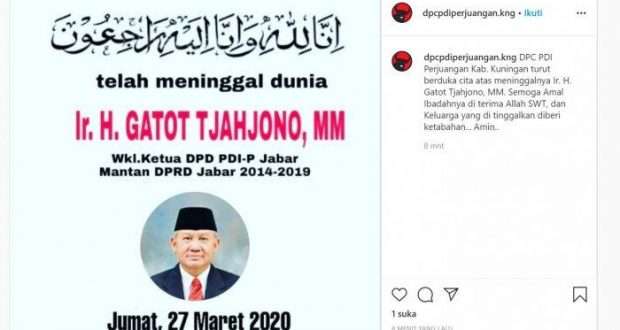 Instagram akun DPC PDIP Kabupaten Kuningan memasang gambar Wakil Ketua DPD PDIP Jawa Barat Ir H Gatot Tjahjono dan ucapan bela sungkawa.