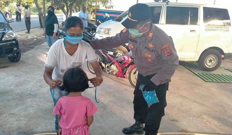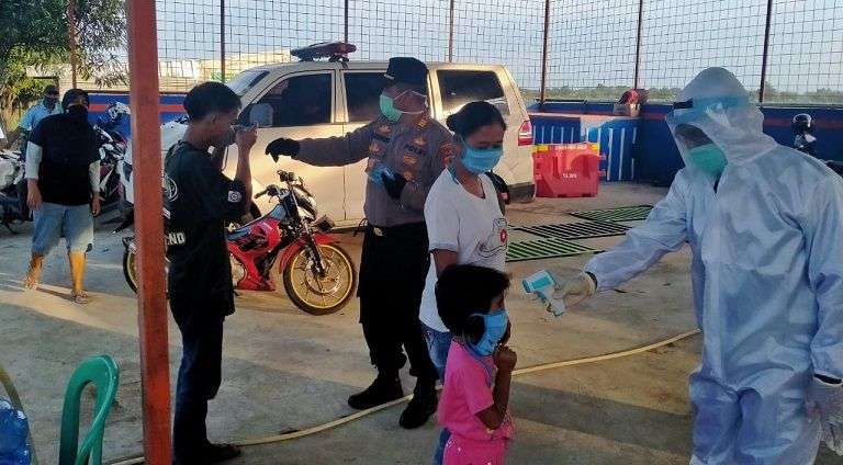 Dalam aktivitasnya, petugas juga melakukan pemeriksaan suhu pengguna jalan, warga lokal di lokasi.