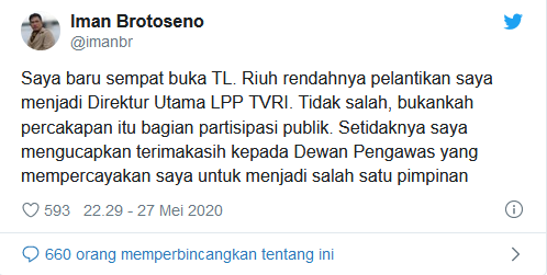 Terkait ramainya pembicaraan mengenai pengangkatan dirinya menjadi Dirut LPP TVRI, Iman Brotoseno sempat buka suara. Tanggapan tersebut dibuat pada 27 Mei 2020 melalui Twitter.