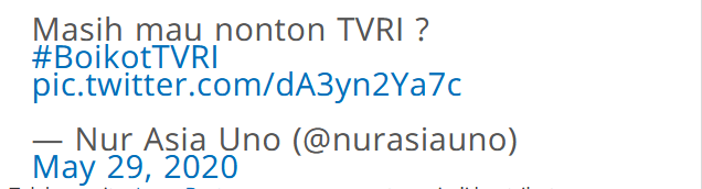 Tagar #BoikotTVRI pun menduduki trending topic nomor satu Indonesia pada Jumat (29/5/2020). Nur Asia pun menggunakan tagar tersebut dalam cuitannya yang berisi jejak digital Iman Brotoseno.