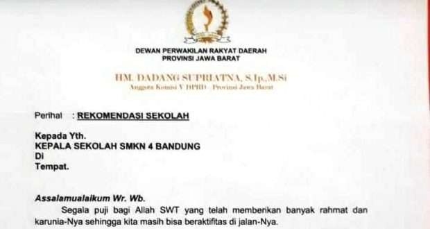 BANDUNG – Pelaksanaan penerimaan peserta didik baru (PPDB) Jawa Barat tahun 2020 ternoda. Surat berkop DPRD Jabar yang merekomendasikan seorang calon siswa agar diterima di sekolah negeri beredar luas. Surat tersebut berkop DPRD Jabar dengan logo kujang. Di bawah kop surat tersebut, tertulis juga nama anggota DPRD Jabar. Surat ditujukan ke Kepala Sekolah SMK Negeri 4 Bandung dengan tujuan tertulis ‘Rekomendasi Sekolah’.
