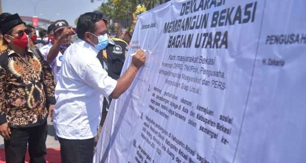 Di akhir acara, Bupati Bekasi menandatangani deklarasi serta pengguntingan pita tanda diresmikannya kantor SMSI, PWI Peduli Bekasi Raya, LBH GMBI, Persikasi dan Keibu. (Jar)