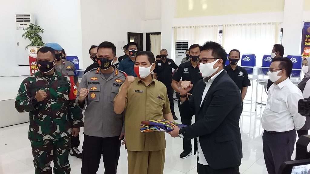 Kapolres Metro Bekasi didampingi Dandim 0509/Kabupaten Bekasi dan Kadis Pariwisata serahkan Alprokes secara simbolis kepada pelaku usaha, Senin (31/08/2020). (Foto: red)