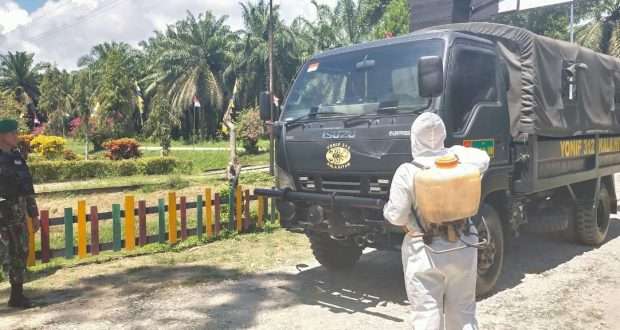 Sementara itu, Serda Salman yang memimpin kegiatan tersebut mengatakan bahwa personil Tim Kesehatan Satgas menyemprotkan disinfektan di perumahan warga, rumah ibadah, dan tempat umum lainnya.