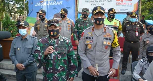 CIMAHI – Pangdam III/Siliwangi Mayjen TNI Nugroho Budi Wiryanto dan Kapolda Jabar Irjen Pol Rudy Sufahriadi mengecek personel yang sedang melaksanakan tugas Operasi Yustisi di Alun-alun Kota Cimahi Jawa Barat, Selasa (15/9/2020).