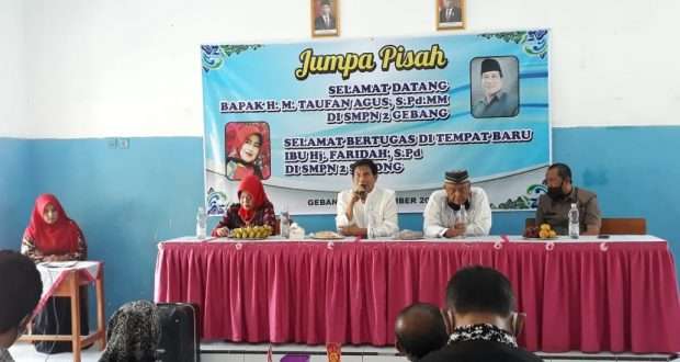 Adapun Kepsek SMPN 2 Gebang yang baru yakni H. Taufan Agus menegaskan sekolah yang dipimpinnya harus lebih bagus dan lebih baik dari sebelumnya. “Hukumnya adalah wajib membuat SMPN 2 Gebang maju, nyaman, bersih, dan sejahtera. Insya Allah pasti bisa. Kuncinya adalah berfikir positif. Insya Allah baik di SMPN 1 Babakan dan SMPN 2 Gebang saya akan memberi kenang-kenangan yang bermanfaat sebelum purna tugas,” kata Taufan dalam sambutan.