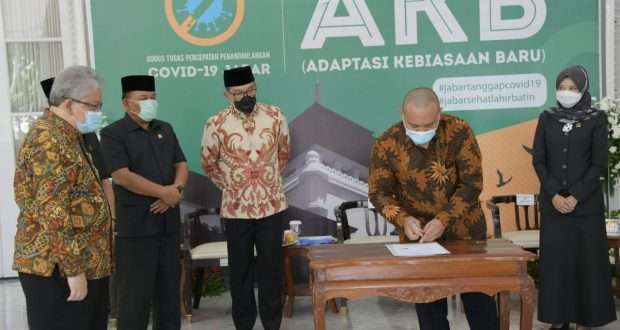 KOTA BANDUNG – Gubernur Jawa Barat (Jabar) Ridwan Kamil menandatangani Perjanjian Pinjaman Daerah Tahun 2020 antara Pemerintah Daerah (Pemda) Provinsi Jabar dan PT Sarana Multi Infrastruktur (Persero) melalui videoconference dari Gedung Pakuan, Kota Bandung, Kamis (24/9/20).