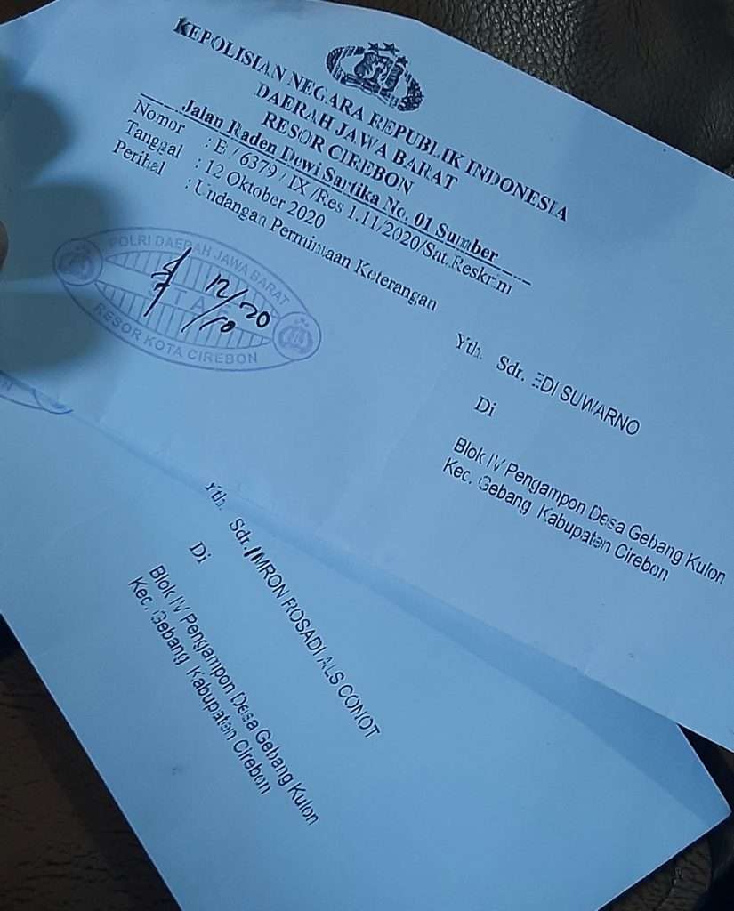 Pihak pertama yang dimintai keterangan yakni Cardi (Wartawan jabarpublisher.com) tanggal 28 September 2020, pihak kedua yakni Ahmad Sobirin alias Wiwing (Mantan Kuwu Gebang Kulon) yang dipanggil seminggu kemudian setelah Cardi. Dan hari ini, Jumat (16/10/2020), dua buah surat kembali dilayangkan Polresta Cirebon untuk saudara Imron alias Conot dan saudara Edi Suwarno yang agendanya yakni akan dimintai keterangan oleh polisi terkait aduan tersebut. Dalam surat tersebut, keduanya akan dimintai keterangan pada hari Selasa (20/10/2020) mendatang. Adapun surat tersebut diantarkan Anggota Sateskrim Polresta Cirebon ke Kantor Kuwu Gebang Kulon usai Shalat Jumat.